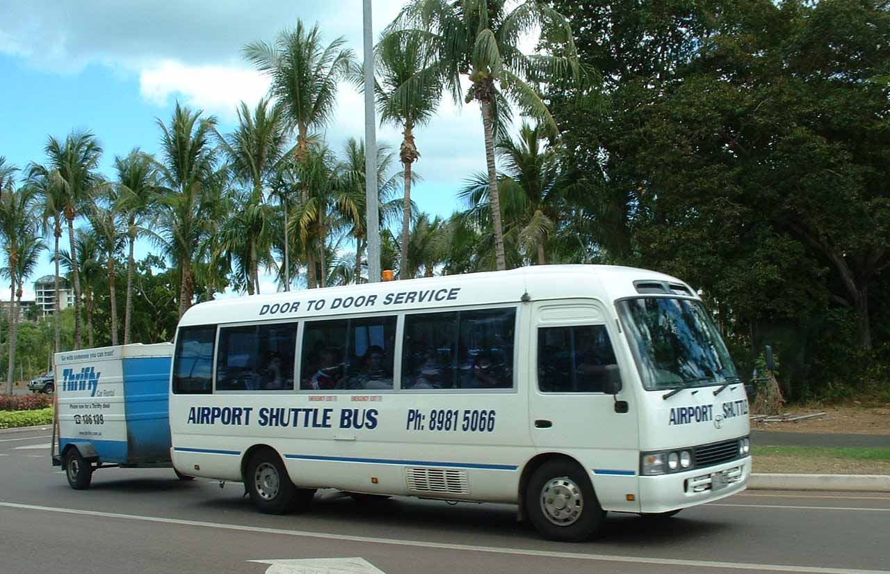 A pair of Toyota Coasters are seen together in Darwin in August 2005. The front Coaster is in the livery of weel known tour company AAT Kings, behind is a courtesy bus for Toddy's, possibly an accommodation shuttle. |