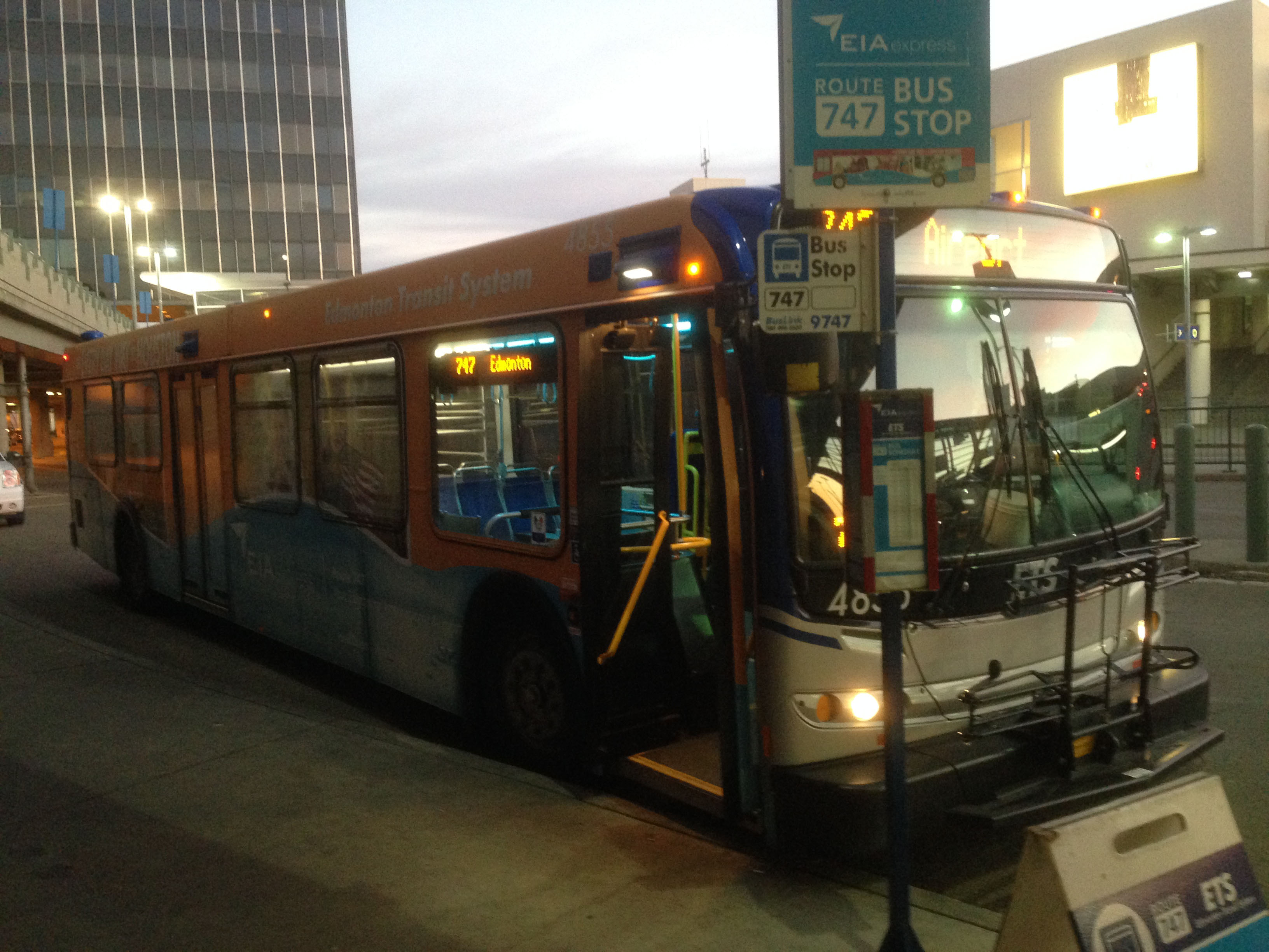 Of course the service to the airport is numbered 747. In a special livery is this New FLyer D40LFR, 4855 of 2009, seen on stand at the airport in the early hours of the morning in October 2014.