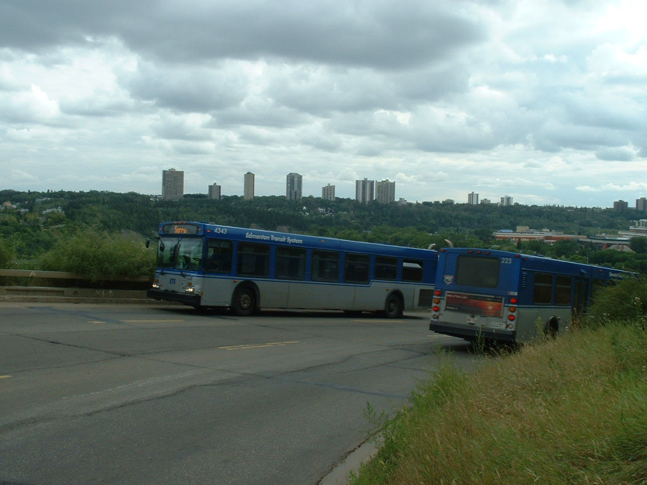 New Flyer 1998 D40F 4076 can just be seen emerging from one of the several bridges crossing the North Saskatchewan River.