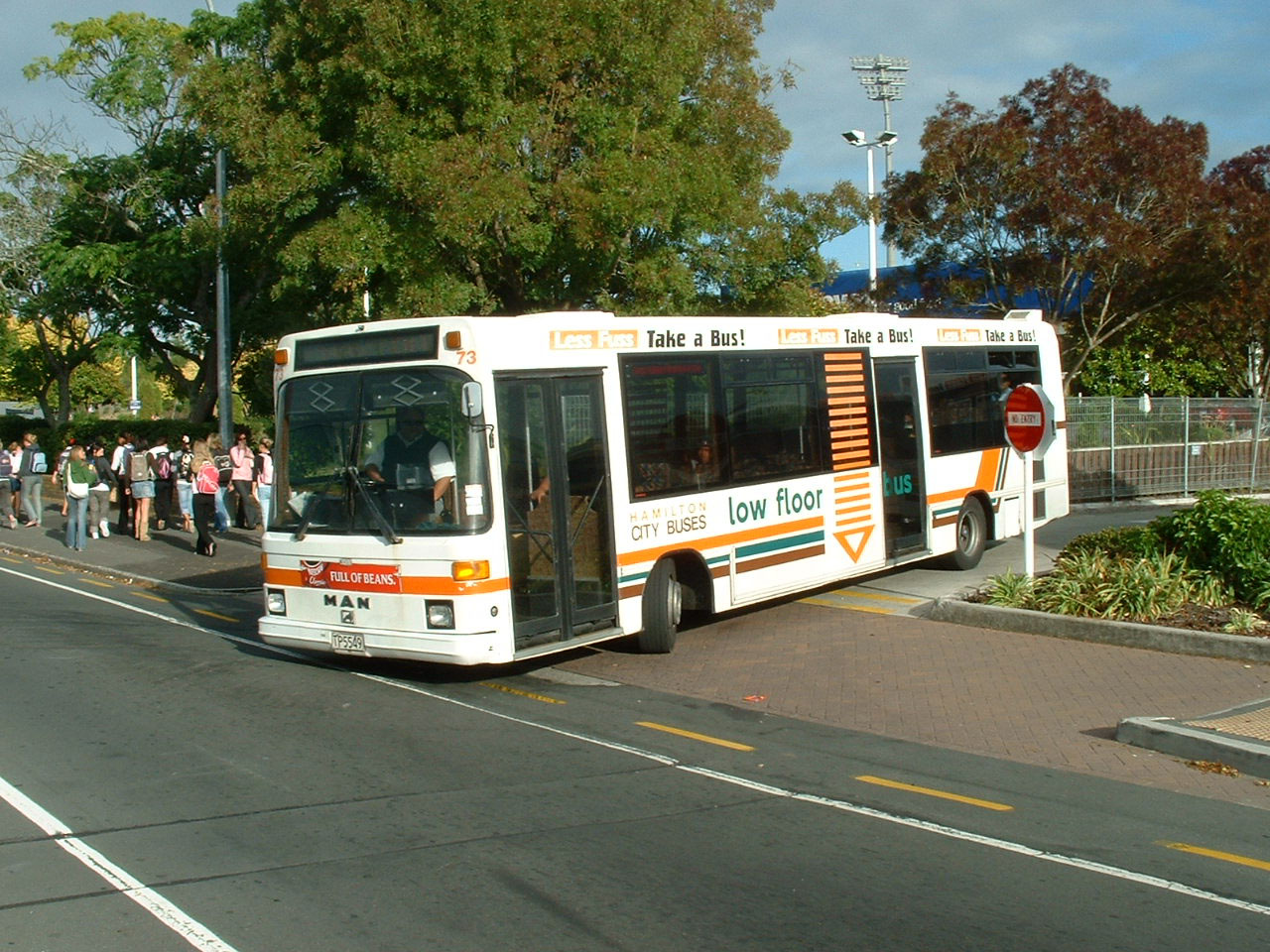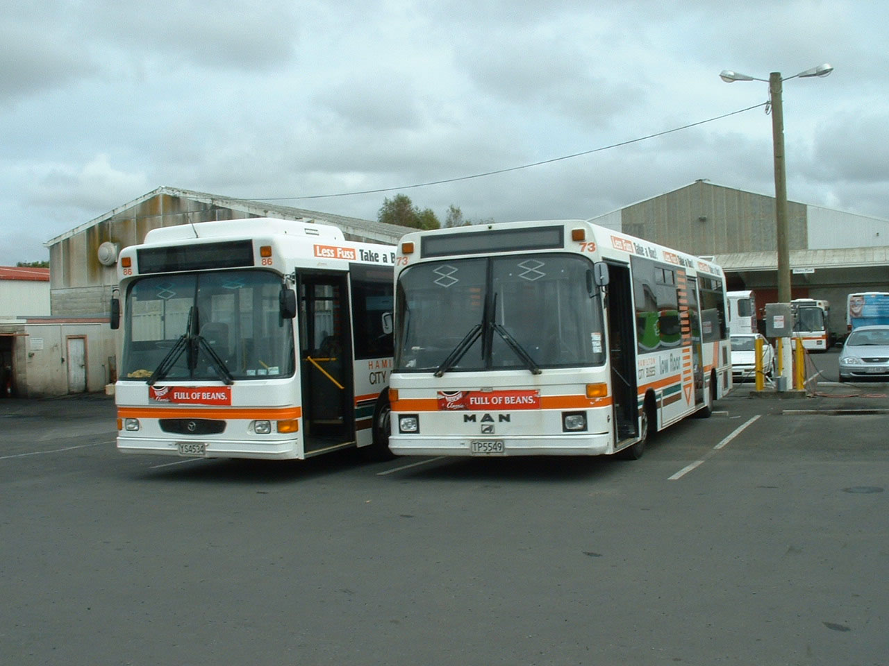 A new livery for Hamilton City Buses had been adopted, probably after privatisation and before the Go-bus identity appeared. This Designline bodied MAN 12.223 of 2004, 78 (BTL973), shows it off in the Bus Station. |