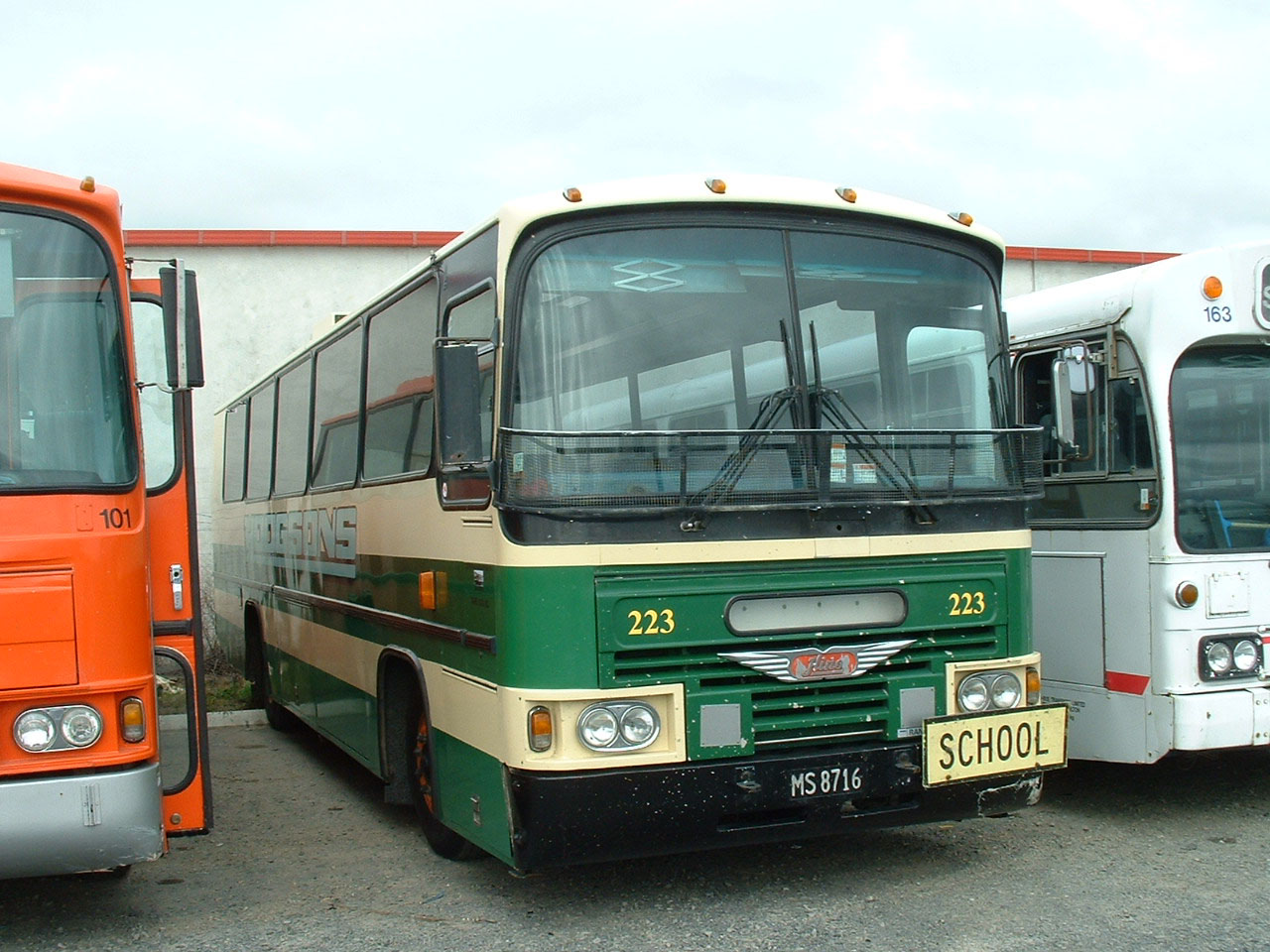 This pair seen in the yard are a bit of a mystery. The small bus in Hodgsons' colours is clearly numbered 228 and looks to be registered AET552. Australian Bus Fleet Lists suggests that 28 was a 2001 Fiat Ducato registered AET452! Contact us if you can help. Similarly the white city bus lacks any identity except, maybe, the fleet number 21 on the rear destination box, probably another ex-Auckland Mercedes. |