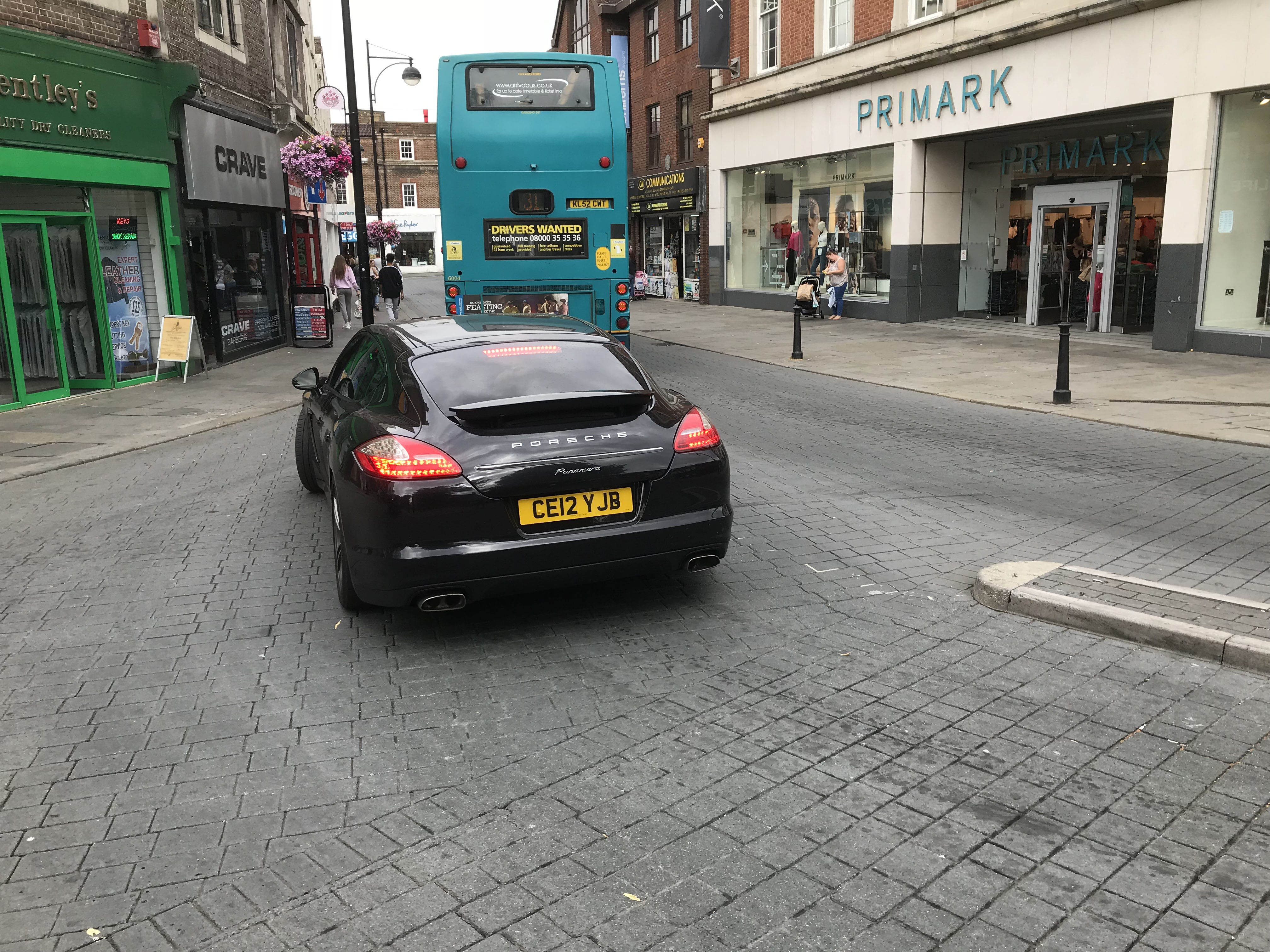 Here is the rear end of 6004 (KL52CWT) an Alexander ALX400 bodied DAF DB250 new to Arriva the Shires in London red for contracts worked from Garston depot in Watford. Seen in High Wycombe in July 2018 it has entered the pedestrianised zone cut through that links the two side of the town centre. Despite "No entry except buses" signs the Porsche driver has chosen to ignore them, a common occurence, as the signage implicitly exempted drivers of black cars made in Germany. After some years of "Wild West" lawlessness the situation was resolved with enforcement cameras and ramped up signage. There is still the occasional driver, blindly following GPS/satnav who blunders into the zone, but otherwise drivers do not risk the fine. The only ones who think they continue to be exempt are Deliveroo, Ubereats, etc scooter drivers who think it is okay to plough into a heavily pedestrianised area without the obvious advantage of being a highly visible ten ton bus.