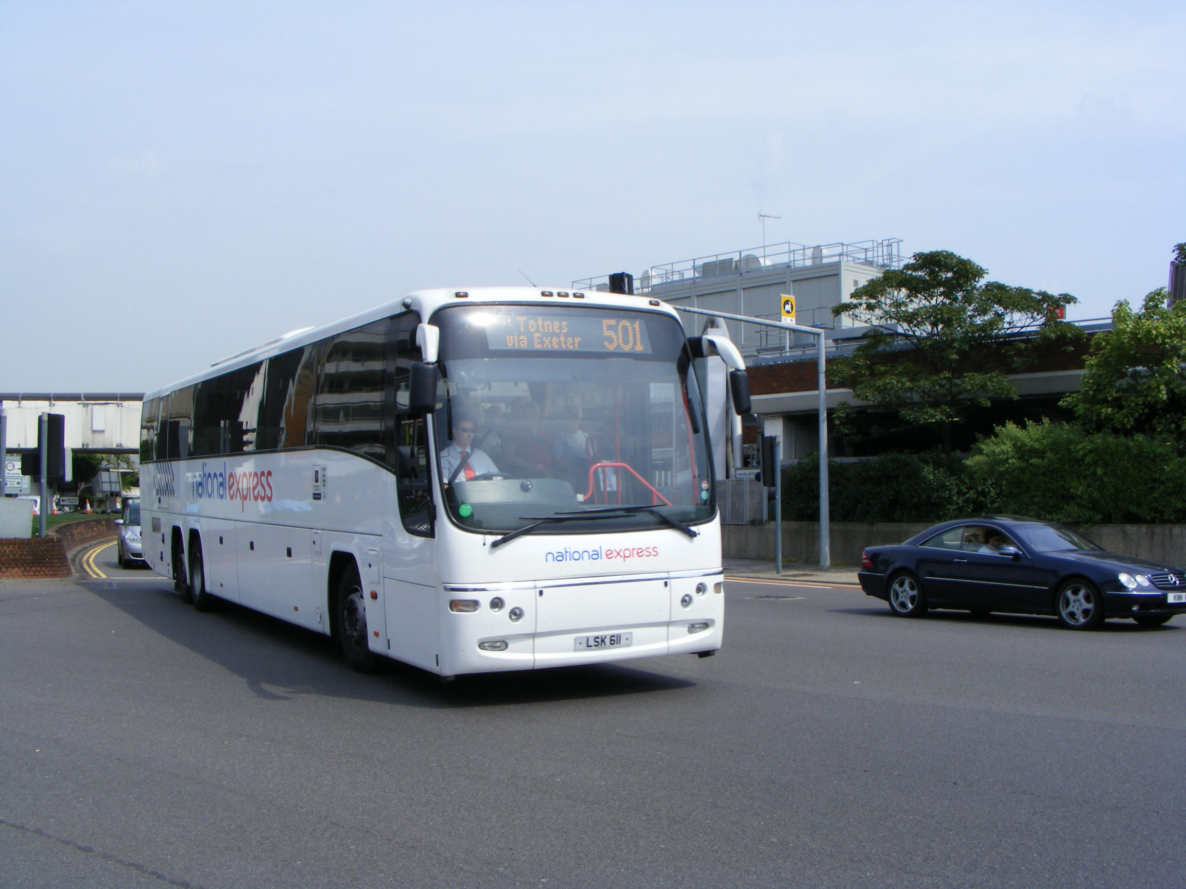The Neoplan Skyliners were withdrawn from service after a fatal accident when one overturned on the motorway interchanges near Heathrow one night. Their replacements in 2009 were these extra long Volvo tri-axle B12BT Plaxton bodied coaches. Seen loading at Exeter Coach Station in August 2014 is LSK830. Picture ref A105. |
